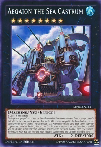 | Text | 2 Level 8 monsters During either player's turn: You can banish 1 random face-down monster from your opponent's Extra Deck, face-up, and if you do, this card's ATK becomes equal to the banished monster's. During either player's turn: You can detach 1 Xyz Material from this card, then target 1 of your opponent's banished Fusion, Synchro, or Xyz Monsters; return it to the Extra Deck, and if you do, destroy 1 monster your opponent controls with the same monster card type (Fusion, Synchro, or Xyz). You can only use each effect of "Aegaion the Sea Castrum" once per turn. |