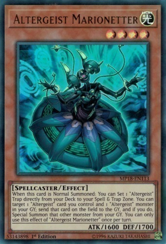 | Text | When this card is Normal Summoned: You can Set 1 "Altergeist" Trap directly from your Deck to your Spell & Trap Zone. You can target 1 "Altergeist" card you control and 1 "Altergeist" monster in your GY; send that card on the field to the GY, and if you do, Special Summon that other monster from your GY. You can only use this effect of "Altergeist Marionetter" once per turn. |