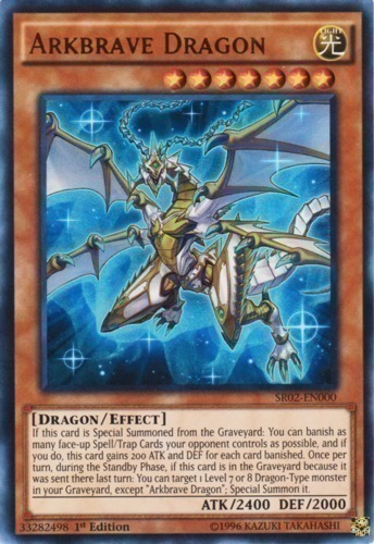 | Text | If this card is Special Summoned from the Graveyard: You can banish as many face-up Spell/Trap Cards your opponent controls as possible, and if you do, this card gains 200 ATK and DEF for each card banished. Once per turn, during the Standby Phase, if this card is in the Graveyard because it was sent there last turn: You can target 1 Level 7 or 8 Dragon-Type monster in your Graveyard, except "Arkbrave Dragon"; Special Summon it. |