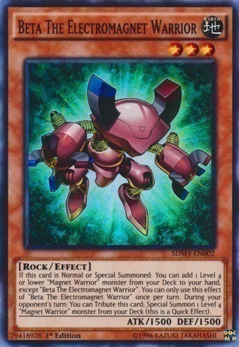 | Text | If this card is Normal or Special Summoned: You can add 1 Level 4 or lower "Magnet Warrior" monster from your Deck to your hand, except "Beta The Electromagnet Warrior". You can only use this effect of "Beta The Electromagnet Warrior" once per turn. During your opponent's turn: You can Tribute this card; Special Summon 1 Level 4 "Magnet Warrior" monster from your Deck (this is a Quick Effect). |