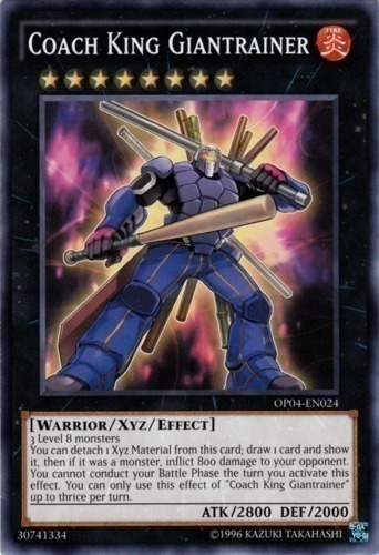 | Text | 3 Level 8 monsters You can detach 1 Xyz Material from this card; draw 1 card and show it, then if it was a monster, inflict 800 damage to your opponent. You cannot conduct your Battle Phase the turn you activate this effect. You can only use this effect of "Coach King Giantrainer" up to thrice per turn. |