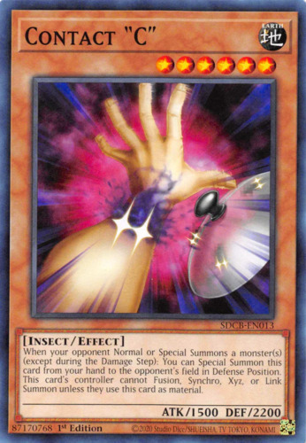 Text When your opponent Normal or Special Summons a monster(s) (except during the Damage Step): You can Special Summon this card from your hand to the opponent's field in Defense Position. This card's controller cannot Fusion, Synchro, Xyz, or Link Summon unless they use this card as material.