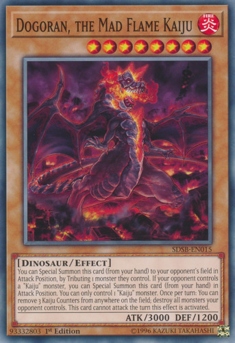 Text You can Special Summon this card (from your hand) to your opponent's field in Attack Position, by Tributing 1 monster they control. If your opponent controls a "Kaiju" monster, you can Special Summon this card (from your hand) in Attack Position. You can only control 1 "Kaiju" monster. Once per turn: You can remove 3 Kaiju Counters from anywhere on the field; destroy all monsters your opponent controls. This card cannot attack the turn this effect is activated.