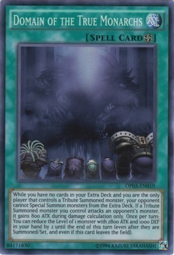 | Text | While you have no cards in your Extra Deck and you are the only player that controls a Tribute Summoned monster, your opponent cannot Special Summon monsters from the Extra Deck. If a Tribute Summoned monster you control attacks an opponent's monster, it gains 800 ATK during damage calculation only. Once per turn: You can reduce the Level of 1 monster with 2800 ATK/1000 DEF in your hand by 2 until the end of this turn (even after they are Summoned/Set, and even if this card leaves the field). |