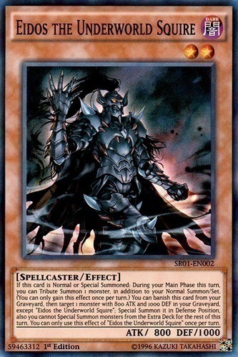 | Text | If this card is Normal or Special Summoned: During your Main Phase this turn, you can Tribute Summon 1 monster, in addition to your Normal Summon/Set. (You can only gain this effect once per turn.) You can banish this card from your Graveyard, then target 1 monster with 800 ATK and 1000 DEF in your Graveyard, except "Eidos the Underworld Squire"; Special Summon it in Defense Position, also you cannot Special Summon monsters from the Extra Deck for the rest of this turn. You can only use this effect of "Eidos the Underworld Squire" once per turn. |