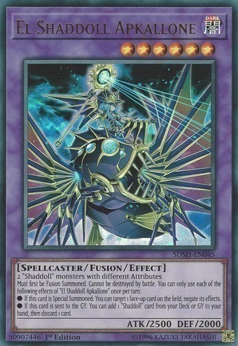 | Text | 2 "Shaddoll" monsters with different Attributes Must first be Fusion Summoned. Cannot be destroyed by battle. You can only use each of the following effects of "El Shaddoll Apkallone" once per turn. ● If this card is Special Summoned: You can target 1 face-up card on the field; negate its effects. ● If this card is sent to the GY: You can add 1 "Shaddoll" card from your Deck or GY to your hand, then discard 1 card. |