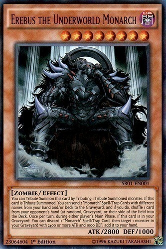 You can Tribute Summon this card by Tributing 1 Tribute Summoned monster. If this card is Tribute Summoned: You can send 2 "Monarch" Spell/Trap Cards with different names from your hand and/or Deck to the Graveyard, and if you do, shuffle 1 card from your opponent's hand (at random), Graveyard, or their side of the field into the Deck. Once per turn, during either player's Main Phase, if this card is in your Graveyard: You can discard 1 "Monarch" Spell/Trap Card, then target 1 monster in your Graveyard with 2400 or more ATK and 1000 DEF; add it to your hand. |