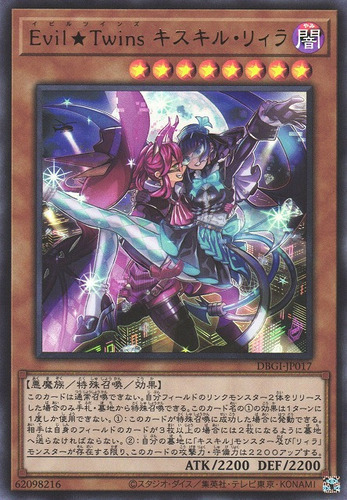 Text Cannot be Normal Summoned/Set. Must be Special Summoned (from your hand or GY) by Tributing 2 Link Monsters. If this card is Special Summoned: You can activate this effect; if your opponent controls 3 or more cards, they must send cards to the GY so they control 2 cards. You can only use this effect of "Evil★Twins Ki-sikil & Lil-la" once per turn. While you have a "Ki-sikil" monster in your GY and you have a "Lil-la" monster in your GY, this card gains 2200 ATK/DEF.