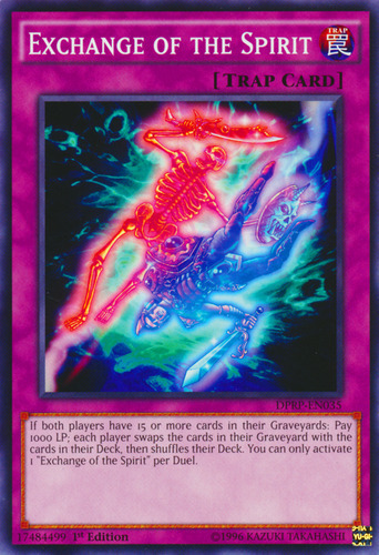 Text If both players have 15 or more cards in their GYs: Pay 1000 LP; each player swaps the cards in their GY with the cards in their Deck, then shuffles their Deck. You can only activate 1 "Exchange of the Spirit" per Duel.