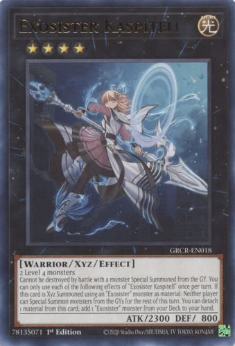 Cannot be destroyed by battle with a monster Special Summoned from the GY. You can only use each of the following effects of "Exosister Kaspitell" once per turn. If this card is Xyz Summoned using an "Exosister" monster as material: Neither player can Special Summon monsters from the GYs for the rest of this turn. You can detach 1 material from this card; add 1 "Exosister" monster from your Deck to your hand.