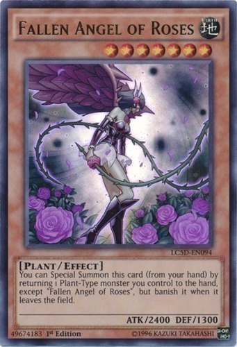 | Text | You can Special Summon this card (from your hand) by returning 1 Plant-Type monster you control to the hand, except "Fallen Angel of Roses", but banish it when it leaves the field. |