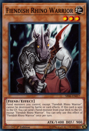 Text Fiend monsters you control, except "Fiendish Rhino Warrior", cannot be destroyed by battle or card effects. If this card is sent to the GY: You can send 1 Fiend monster from your Deck to the GY, except "Fiendish Rhino Warrior". You can only use this effect of "Fiendish Rhino Warrior" once per turn.