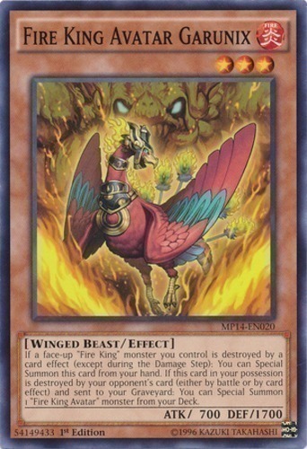 | Text | If a face-up "Fire King" monster you control is destroyed by a card effect (except during the Damage Step): You can Special Summon this card from your hand. If this card in your possession is destroyed by your opponent's card (either by battle or by card effect) and sent to your Graveyard: You can Special Summon 1 "Fire King Avatar" monster from your Deck. |