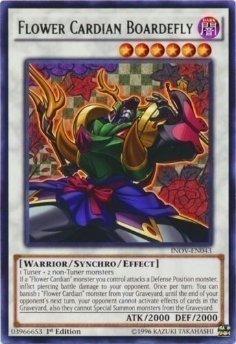| Text | 1 Tuner + 2 non-Tuner monsters If a "Flower Cardian" monster you control attacks a Defense Position monster, inflict piercing battle damage to your opponent. Once per turn: You can banish 1 "Flower Cardian" monster from your Graveyard; until the end of your opponent's next turn, your opponent cannot activate effects of cards in the Graveyard, also they cannot Special Summon monsters from the Graveyard. |