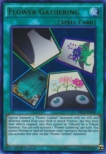 | Text | Special Summon 4 "Flower Cardian" monsters with 100 ATK and different names from your Deck in Attack Position, but they have their effects negated, also they cannot be Tributed for a Tribute Summon. You can only activate 1 "Flower Gathering" per turn. You cannot Normal or Special Summon other monsters during the turn you activate this card, except "Flower Cardian" monsters. |