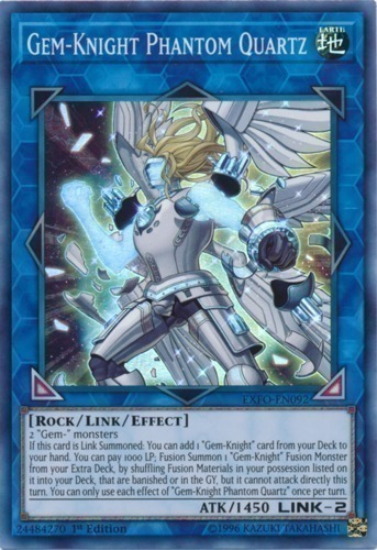 | Text | 2 "Gem-" monsters If this card is Link Summoned: You can add 1 "Gem-Knight" card from your Deck to your hand. You can pay 1000 LP; Fusion Summon 1 "Gem-Knight" Fusion Monster from your Extra Deck, by shuffling Fusion Materials in your possession listed on it into your Deck, that are banished or in the GY, but it cannot attack directly this turn. You can only use each effect of "Gem-Knight Phantom Quartz" once per turn. |