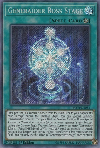 | Text | Once per turn, if a card(s) is added from the Main Deck to your opponent's hand (except during the Damage Step): You can Special Summon 1 "Generaider" monster from your Deck in Defense Position. If you Special Summon a "Generaider" monster(s) during your opponent's turn (except during the Damage Step): You can Special Summon as many "Generaider Tokens" (Fairy/LIGHT/Level 4/ATK 1500/DEF 1500) as possible in Attack Position, but destroy them during the End Phase (even if this card leaves the field). You can only use this effect of "Generaider Boss Stage" once per turn. |