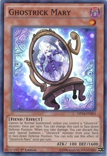 | Text | Cannot be Normal Summoned, unless you control a "Ghostrick" monster. Once per turn: You can change this card to face-down Defense Position. When you take damage: You can discard this card; Special Summon 1 "Ghostrick" monster from your Deck in face-down Defense Position. You can only use this effect of "Ghostrick Mary" once per turn. |