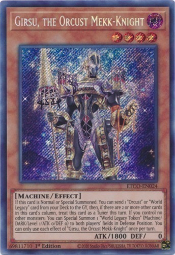 | Text | If this card is Normal or Special Summoned: You can send 1 "Orcust" or "World Legacy" card from your Deck to the GY, then, if there are 2 or more other cards in this card's column, treat this card as a Tuner this turn. If you control no other monsters: You can Special Summon 1 "World Legacy Token" (Machine/DARK/Level 1/ATK 0/DEF 0) to both players' fields in Defense Position. You can only use each effect of "Girsu, the Orcust Mekk-Knight" once per turn. |