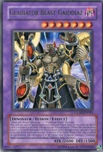 | Text | "Gladiator Beast Spartacus" + 1 "Gladiator Beast" monster This card can only be Special Summoned from your Extra Deck, by returning the above cards you control to the Deck. (You do not use "Polymerization".) When this card destroys a monster by battle and sends it to the Graveyard, inflict damage to your opponent equal to the DEF of the destroyed monster. At the end of the Battle Phase, if this card attacked or was attacked, you can return it to the Extra Deck to Special Summon 2 "Gladiator Beast" monsters from your Deck, except "Gladiator Beast Spartacus". |