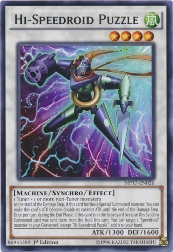 | Text | 1 Tuner + 1 or more non-Tuner monsters At the start of the Damage Step, if this card battles a Special Summoned monster: You can make this card's ATK become double its current ATK until the end of the Damage Step. Once per turn, during the End Phase, if this card is in the Graveyard because this Synchro Summoned card was sent there from the field this turn: You can target 1 "Speedroid" monster in your Graveyard, except "Hi-Speedroid Puzzle"; add it to your hand. |