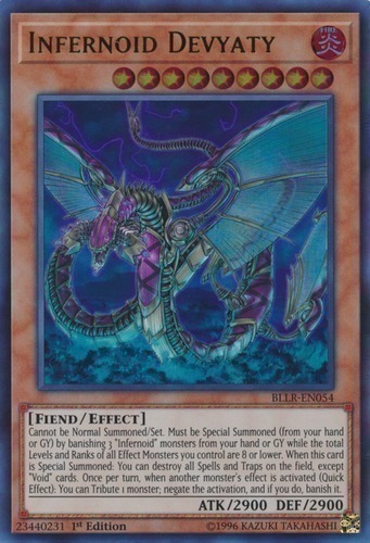 | Text | Cannot be Normal Summoned/Set. Must be Special Summoned (from your hand or GY) by banishing 3 "Infernoid" monsters from your hand or GY while the total Levels and Ranks of all Effect Monsters you control are 8 or lower. When this card is Special Summoned: You can destroy all Spells and Traps on the field, except "Void" cards. Once per turn, when another monster's effect is activated (Quick Effect): You can Tribute 1 monster; negate the activation, and if you do, banish it. |