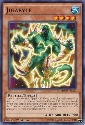 | Text | You can only control 1 "Jigabyte". If you control a Spellcaster-Type monster, you can Special Summon this card (from your hand). When this card is destroyed by battle or card effect and sent to the Graveyard: You can Special Summon 1 monster with 1500 ATK and 200 DEF from your Deck, except "Jigabyte". |