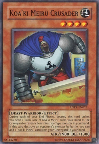 | Text | During each of your End Phases, destroy this card unless you send 1 "Iron Core of Koa'ki Meiru" from your hand to the Graveyard or reveal 1 Beast-Warrior-Type monster in your hand. If this card destroys an opponent's monster by battle, you can add 1 "Koa'ki Meiru" card from your Graveyard to your hand. |