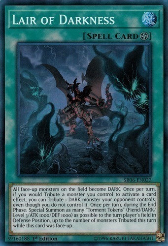 | Text | All face-up monsters on the field become DARK. Once per turn, if you would Tribute a monster you control to activate a card effect, you can Tribute 1 DARK monster your opponent controls, even though you do not control it. Once per turn, during the End Phase: Special Summon as many "Torment Tokens" (Fiend/DARK/Level 3/ATK 1000/DEF 1000) as possible to the turn player's field in Defense Position, up to the number of monsters Tributed this turn while this card was face-up. |