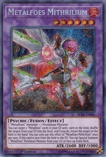 | Text | 1 "Metalfoes" monster + 1 Pendulum Monster You can target 2 "Metalfoes" cards in your GY and 1 card on the field; shuffle the targets from your GY into the Deck, and if you do, return the target on the field to the hand. You can only use this effect of "Metalfoes Mithrilium" once per turn. If this card is sent from the field to the GY: You can Special Summon 1 "Metalfoes" Pendulum Monster from your GY or face-up Extra Deck. |