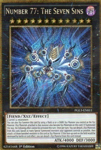 | Text | 2 Level 12 monsters You can also Xyz Summon this card by using a Rank 10 or 11 DARK Xyz Monster you control as the Xyz Material. (Xyz Materials attached to that monster also become Xyz Materials on this card.) If Summoned this way, the following effect cannot be activated this turn. Once per turn: You can detach 2 Xyz Materials from this card; banish as many Special Summoned monsters your opponent controls as possible, then attach 1 of those banished monsters to this card as Xyz Material. If this face-up card on the field would be destroyed by battle or card effect, you can detach 1 Xyz Material from this card instead. |