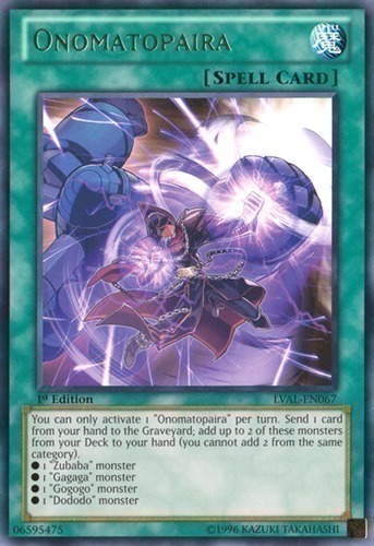 | Text | You can only activate 1 "Onomatopaira" per turn. Send 1 card from your hand to the GY; add up to 2 of these monsters from your Deck to your hand (you cannot add 2 from the same category). ● 1 "Zubaba" monster ● 1 "Gagaga" monster ● 1 "Gogogo" monster ● 1 "Dododo" monster |