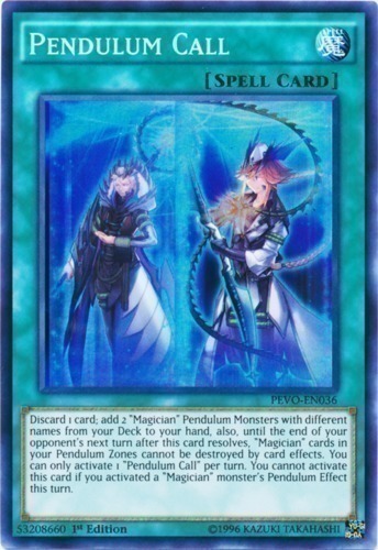 | Text | Discard 1 card; add 2 "Magician" Pendulum Monsters with different names from your Deck to your hand, also, until the end of your opponent's next turn after this card resolves, "Magician" cards in your Pendulum Zones cannot be destroyed by card effects. You can only activate 1 "Pendulum Call" per turn. You cannot activate this card if you activated a "Magician" monster's Pendulum Effect this turn. |