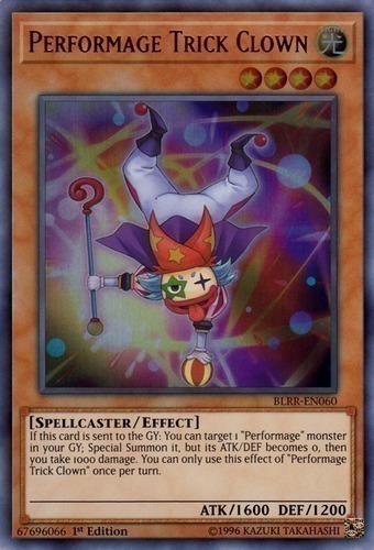 Text If this card is sent to the GY: You can target 1 "Performage" monster in your GY; Special Summon it, but its ATK/DEF become 0, then you take 1000 damage. You can only use this effect of "Performage Trick Clown" once per turn.