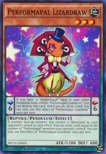 | Text | Pendulum Effect: If you have a "Performapal" card in your other Pendulum Zone, except "Performapal Lizardraw": You can destroy this card, and if you do, draw 1 card. You can only use this effect of "Performapal Lizardraw" once per turn. Monster Effect: If another face-up monster you control is destroyed by your opponent's attack or card effect: You can draw cards equal to the number of "Performapal" monsters you currently control. You can only use this effect of "Performapal Lizardraw" once per turn. |