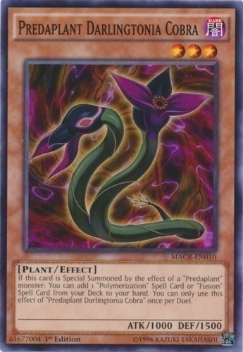 | Text | If this card is Special Summoned by the effect of a "Predaplant" monster: You can add 1 "Polymerization" Spell Card or "Fusion" Spell Card from your Deck to your hand. You can only use this effect of "Predaplant Darlingtonia Cobra" once per Duel. |