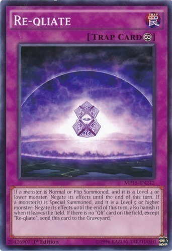 | Text | If a monster is Normal or Flip Summoned, and it is a Level 4 or lower monster: Negate its effects until the end of this turn. If a monster(s) is Special Summoned, and it is a Level 5 or higher monster: Negate its effects until the end of this turn, also banish it when it leaves the field. If there is no "Qli" card on the field, except "Re-qliate", send this card to the Graveyard. |