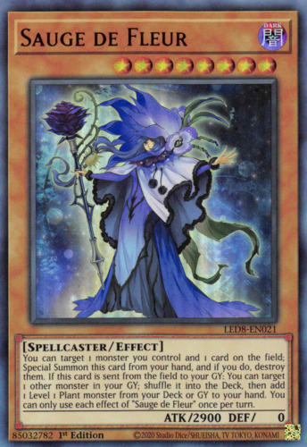 Text You can target 1 monster you control and 1 card on the field; Special Summon this card from your hand, and if you do, destroy them. If this card is sent from the field to your GY: You can target 1 other monster in your GY; shuffle it into the Deck, then add 1 Level 1 Plant monster from your Deck or GY to your hand. You can only use each effect of "Sauge de Fleur" once per turn.