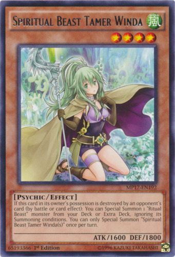 Text If this card in its owner's possession is destroyed by an opponent's card: You can Special Summon 1 "Ritual Beast" monster from your Deck or Extra Deck, ignoring its Summoning conditions. You can only Special Summon "Spiritual Beast Tamer Winda(s)" once per turn.