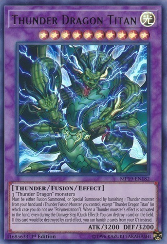 | Text | 3 "Thunder Dragon" monsters Must be either Fusion Summoned, or Special Summoned by banishing 1 Thunder monster from your hand and 1 Thunder Fusion Monster you control, except "Thunder Dragon Titan" (in which case you do not use "Polymerization"). When a Thunder monster's effect is activated in the hand, even during the Damage Step (Quick Effect): You can destroy 1 card on the field. If this card would be destroyed by card effect, you can banish 2 cards from your GY instead. |