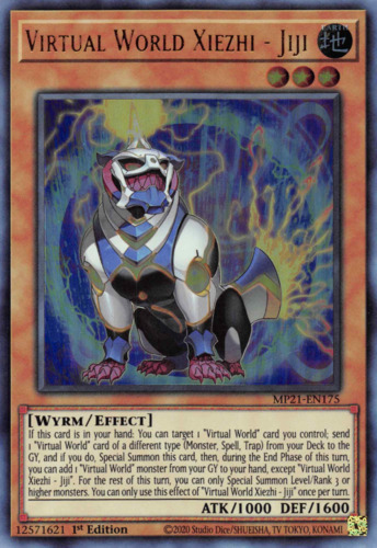 If this card is in your hand: You can target 1 "Virtual World" card you control; send 1 "Virtual World" card of a different type (Monster, Spell, Trap) from your Deck to the GY, and if you do, Special Summon this card, then, during the End Phase of this turn, you can add 1 "Virtual World" monster from your GY to your hand, except "Virtual World Xiezhi - Jiji". For the rest of this turn, you can only Special Summon Level/Rank 3 or higher monsters. You can only use this effect of "Virtual World Xiezhi - Jiji" once per turn. |