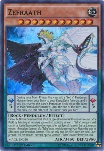 | Text | Pendulum Effect: During your Main Phase: You can add 1 "Zefra" Pendulum Monster from your Deck to your Extra Deck face-up, and if you do, change this card's Pendulum Scale to be the same as that Pendulum Monster's, until the end of this turn. You can only use this effect of "Zefraath" once per turn. Monster Effect: Cannot be Normal Summoned/Set. Must be Special Summoned (from your face-up Extra Deck) by Tributing all monsters you control, including at least 3 "Zefra" monsters, and cannot be Special Summoned by other ways. After you Special Summon this card, you can conduct 1 Pendulum Summon of a "Zefra" monster(s) during your Main Phase this turn, in addition to your Pendulum Summon. (You can only gain this effect once per turn.) Once per turn: You can Tribute 1 monster; Special Summon 1 "Zefra" monster from your Deck. |