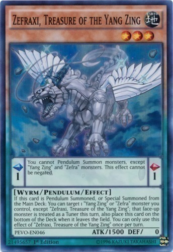 | Text | Pendulum Effect: You cannot Pendulum Summon monsters, except "Yang Zing" and "Zefra" monsters. This effect cannot be negated. Monster Effect: If this card is Pendulum Summoned, or Special Summoned from the Main Deck: You can target 1 "Yang Zing" or "Zefra" monster you control, except "Zefraxi, Treasure of the Yang Zing"; that face-up monster is treated as a Tuner this turn, also place this card on the bottom of the Deck when it leaves the field. You can only use this effect of "Zefraxi, Treasure of the Yang Zing" once per turn. |